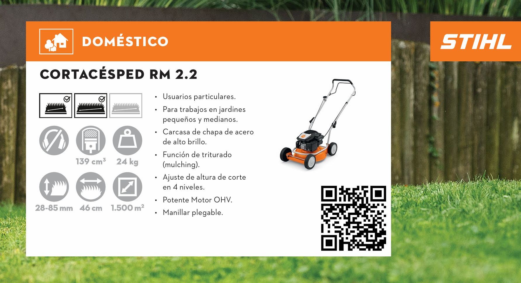STIHL RM 2.2 R es una herramienta ideal para trabajos exigentes en el jardín. Está diseñado principalmente para superficies medianas de hasta 1.500 m² con ancho de corte de 46 cm.